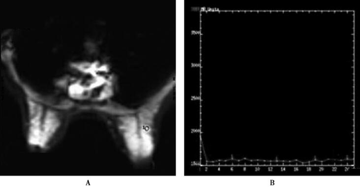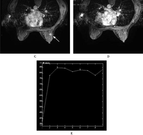 该病例鉴别诊断要考虑到乳腺纤维腺瘤,纤维腺瘤的边缘清晰光滑,TIC曲线多呈持续型或平台型,该病例TIC曲线呈平台型,需要与之鉴别诊断。由于该病例的鉴别诊断困难,参考T2*WI首次通过灌注图像,结果病灶无明显灌注,时间-信号强度曲线趋近于平台型,未见信号丢失,这些改变符合良性病变特点,有利于鉴别诊断。