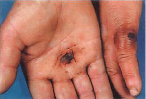 右手掌心有一1cm×1cm大的暗红色半球形结节,中央亦有脐凹,周围绕以红晕,质地较硬,无触痛;左手小指外侧有一同样大小的暗红色半球形结节,中央略凹,表面破溃、结痂,周围绕以红晕及脓肿(图1),质地较硬,有触痛;左手略肿胀。