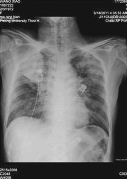 图1 入院时胸片示双肺纹理增多、模糊,可见多发片状模糊影,以右上肺为著,双肺门模糊,心影大小及形态未见异常