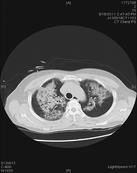 辅助检查:2011年3月18日血常规:WBC 15.97×109/L,N 89.5%,Hb 179g/L,PLT 142×109/L,肝肾功能、心肌酶正常,血糖19.8mmol/L,TNT(−),D-二聚体0.65ng/ml,BNP>5000pg/ml;尿常规:比重1.025,尿糖(++++),尿酮体(+++),尿蛋白微量;血气分析示:pH 7.17,PO2 68mmHg,PCO2 16mmHg,5.8mmol/L,SaO2 87%;胸片(1)示双肺纹理增多、模糊,可见多发片状模糊影,以右上肺为著,双肺门模糊,心影大小及形态未见异常,两膈面光滑,肋膈角锐利;胸部CT(图2)示双肺广泛分布斑片、团片状磨玻璃影,边界模糊,纵隔未见明显肿大淋巴结,心影无明显增大。诊断双肺多发病变——感染?肺水肿?ECG示窦性心动过速,非特异性T波改变。超声心动图示左心室壁运动弥漫减低,主动脉瓣反流(轻度),三尖瓣反流(轻度),LVEF 25%。