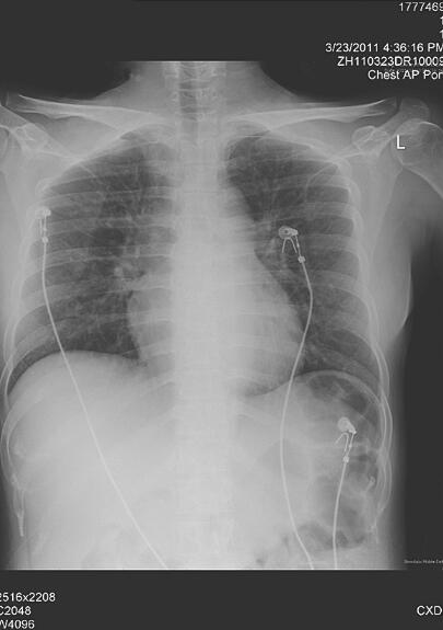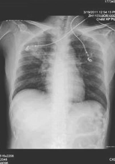 患者,女,39岁,农民。主因“咳嗽、咳痰12天,气短5天”于2011年3月19日收入急诊科。患者入院前12天无明显诱因出现咽痛、咳嗽、咳黄痰,伴心悸,无发热,无腹痛、腹泻,无胸闷、胸痛,当地诊所予抗感染、补液治疗(具体不详),无好转,5天前患者出现活动后气短伴四肢乏力、全身酸痛,外院查血常规示WBC 10.64×109/L,N 83.3%,血糖22.5mmol/L,胸片示双下肺纹理稍重,心电图示窦性心动过速,考虑“急性心肌炎、糖尿病”,予降糖、利尿等治疗,效果不佳,呼吸困难逐渐加重,不能平卧,转至笔者医院急诊科。既往糖尿病病史3年,服用格列齐特治疗,未监测血糖。否认高血压、心脏病病史。否认食物及药物过敏史。