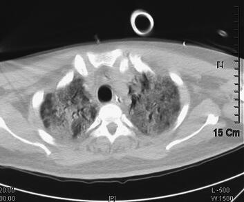 辅助检查:2011年4月5日胸部CT示双肺感染(图1)。血气分析:pH 7.40,PCO2 38.2mmHg,PO2 35.6mmHg,22.9mmol/L,BE −0.7mmol/L,SBE −1.0mmol/L,SaO2 65.0%,提示低氧血症;血常规:WBC 16.8×109/L,Hb 172g/L,PLT 56×109/L,N 0.917;急诊生化:ALT 89IU/L,TBTL 49.0μmol/L,Glu 7.64mmol/L,UREA 14.30mmol/L,CREA 132μmol/L,cTnI 0.04ng/ml。
