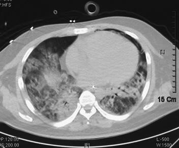 40岁男性患者,1周前无明显诱因下出现发热,体温最高达39℃,伴咳嗽、咳痰,有畏寒,曾至当地医院就诊,诊断为“肺部感染”,抗感染治疗后未见明显好转。4天前开始出现呼吸困难,气促明显,伴口唇发绀,来笔者医院急诊。