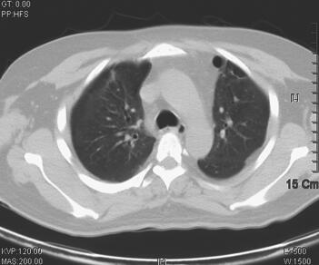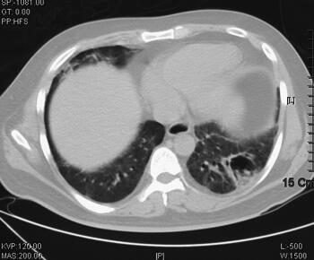 图3 2011年6月8日胸部CT示双肺感染较前继续明显好转,左下肺空洞形成