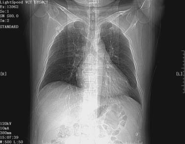 患者,男性,77岁,退休干部。因“胸闷、喘憋伴咳嗽、咳痰1周,加重2小时。”于2006年6月8日就诊于急诊科。该患者入院1周前因用力排便时突然出现胸闷、喘憋,伴大汗、心悸、咳嗽、咳痰,呈白色黏痰,痰不易咳出,不能平卧,无发热、咯血、痰中带血,无胸痛、背痛、晕厥、四肢冰冷,恶心、呕吐,无尿频、尿急、尿痛、腰痛,经休息及自服硝酸甘油、速效救心丸(具体剂量及用法不详)后约20分钟上述症状明显缓解,此后上述症状反复出现,多为体力活动或排便等因素诱发,偶可休息时出现夜间不能平卧,进食差,未到当地医院行进一步系统诊治。入院前2小时无明显诱因再次出现上述症状来笔者医院急诊科就诊。门诊以冠心病,急性左心衰竭收入院。陈旧性肺结核病史60余年,高血压病史20余年,冠心病病史15年,脑梗死病史7年,陈旧性前壁心肌梗死病史5年,心脏永久性起搏器植入术1年。否认糖尿病、甲状腺功能亢进或减低、慢性支气管炎、慢性阻塞性肺疾病、肺源性心脏病、风湿性心脏病、结缔组织病等慢性病史及肝炎等其他传染病病史、密切接触史。近3周无上呼吸道感染、腹泻。