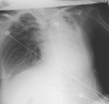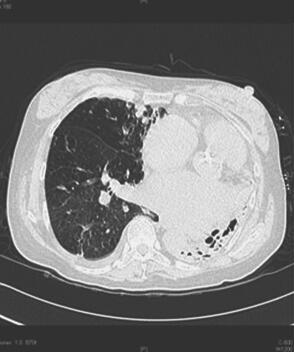 图1 胸片示左肺不张或硬变,纵隔左移,肺内结构观察欠清;右上肺纤维增殖性结核灶;右下肺纹理稍增多、模糊,考虑少许支气管周围炎