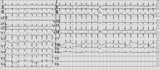 图1 频速型房颤,左前分支阻滞,左心室肥大伴劳损,部分导联ST段抬高