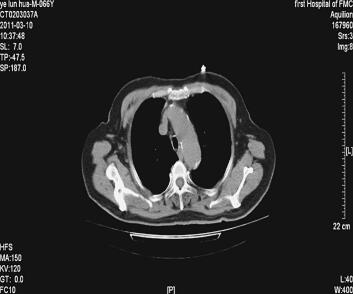 图2 右肺中叶慢性炎症,心影增大,主动脉硬化