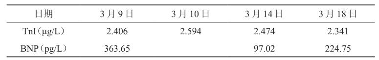 因此入院后予头孢哌酮-舒巴坦钠、多索茶碱、氨溴索等积极抗感染及解痉平喘,同时短期应用小剂量的甲泼尼龙40mg,每天1次静点,共3天;在此基础上予积极改善心肌缺血、纠正心力衰竭、控制血糖等治疗。治疗10天后患者气促明显好转,夜间能平卧,无胸闷;BP 130/70~140/80mmHg;末梢SaO2 97%~99%;双肺哮鸣音及湿啰音消失,仅少许干啰音;HR 70~90次/分,心房纤颤;双下肢水肿消退;但TnI及BNP改善不明显(表1)。
