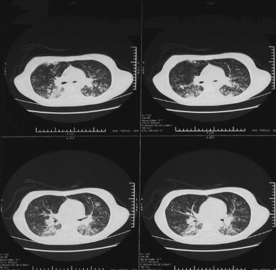 诊治经过:血常规:WBC 8.79×109/L,N 83.1%,Hb 97g/L,HCT 28%,PLT 206×109/L;血气分析:pH 7.432,PCO2 40.0mmHg,PO2 92.3mmHg,BE−2.2mmol/L,HCO3 26.4mmHg,PO2 98.3%。头颅CT:左侧海马可疑斑片状低密度影:海马变性?轻度脑萎缩?左颞极蛛网膜下腔增宽。腰穿压力185cmH2O。脑脊液常规:无色清,PandyT阴性,细胞数32/μl,白细胞数2/μl,多核细胞0/μl,单核细胞0/μl。脑脊液生化:Pro 15.0mg/dl,Cl− 130.0mmol/L,Glu 3.0mmol/L。脑脊液结眀试验(−),结核分枝杆菌抗体(−)。Touch试验:EB-VAC-IgG、CMVIgG、HSV-I-IgG均为(+);EB-VAC-IgM、CMV-IgM、HSV-I-IgM、COX-IgG、COX-IgM均为(−)。胸片提示肺部感染;胸片提示两肺纹理粗重、模糊;多次痰培养结果回报为金黄色葡萄球菌,对磺胺类、万古霉素、链霉素敏感;行肺CT检查提示双肺多发渗出性病变(图1)。