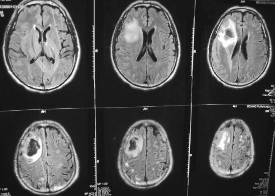 图3 2009年1月12日入院时,头颅MRI示颅内多发病灶
