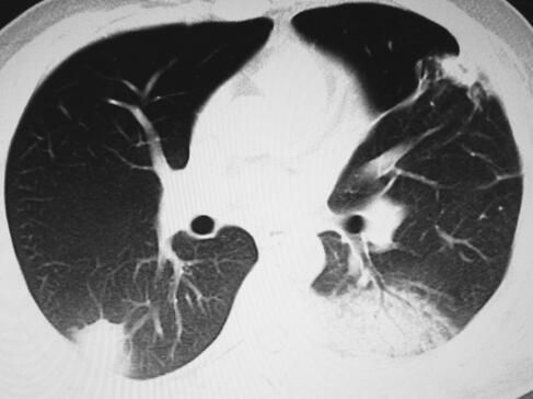 患者,男性,21岁。主诉“发热4个月,喘憋1周”于2010年3月4日来诊。患者自述4个月前一次着凉后出现发热,体温39℃左右。伴咳嗽,干咳为主,少量白痰,发热时伴有头痛、肌肉酸痛,咳嗽时有轻度胸痛。无喷嚏、鼻塞、流涕、咽痛,无呕吐、腹泻,无心悸、腹痛等不适。当地诊所考虑“肺炎”,给予阿莫西林、氨曲南点滴和感冒冲剂、板蓝根口服治疗。间断治疗1个月效果不佳,仍每日发热,偶有畏寒、寒战,体温高峰38~41℃,仍有干咳伴极少量黄白痰,咳嗽时伴有双侧胸部疼痛。遂转至当地市医院呼吸科住院治疗。查血常规:WBC 8.8×109/L,N 73.6%,Hb 130g/L,PLT 117×109/L;肝功能:TBil 39.2μmol/L,DBil 20.0μmol/L,ALT 110U/L,Alb 30g/L;肾功能:Cr 88μmol/L,BUN 6.51mmol/L;心肌酶谱:CK 329U/L,CKMB 73μg/L,LDH 1092U/L;尿便常规正常;心电图提示窦性心动过速。查肺炎衣原体抗体1∶40,冷凝集试验1∶64;肺炎支原体抗体、军团菌抗体、结核分枝杆菌抗体均阴性;查胸部CT提示少许条索影(图1)。