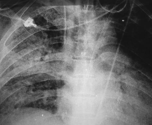 诊治经过:入室后给予吸氧监护,抽血培养,每小时1次,共抽3次血培养后开始经验性抗感染治疗。选用万古霉素+阿米卡星联合治疗,以及其他输液支持对症治疗。患者体温、症状、氧合以及一般情况仍无好转,第3天将阿米卡星换为亚胺培南-西司他汀钠。第4天因患者储氧面罩吸氧时氧合在90%左右,给予患者经口气管插管接呼吸机辅助通气,氧浓度50%+PEEP 10cmH2O的条件下可维持指氧93%左右。多次经气管插管吸痰送检细菌、真菌、结核涂片、培养均阴性,5次血培养结果均阴性,抽血查免疫全套、肿瘤标志物全套均阴性,复查床旁胸片提示双肺多发渗出(图3)。