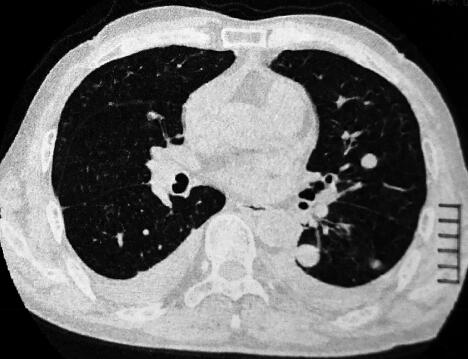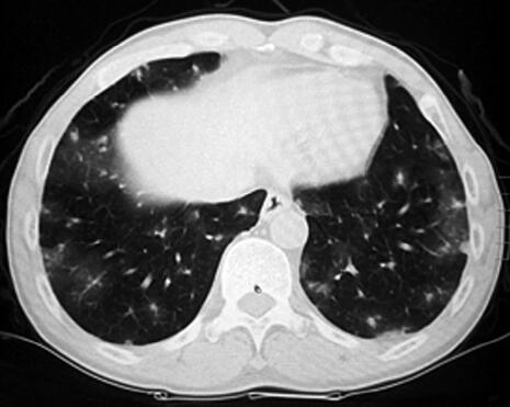 54岁男性,半年前开始出现少量痰中带血,无明确诱因,其后咯整口鲜血,无胸痛,有轻度活动后气短。于当地诊所检查,胸部CT示双肺多发磨玻璃影,团片影、边缘呈晕轮征。给予抗感染及止血对症治疗(具体不详),咯血有所减轻。两个月前,患者为明确诊断就诊于医院。该患者患有……