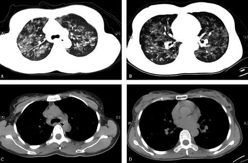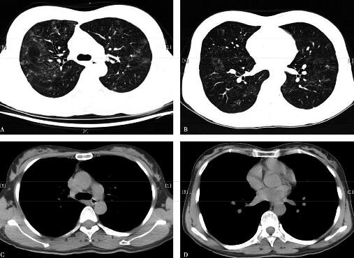 7.胸部高分辨CT(2008年12月25日):双肺纹理增多紊乱,双肺弥漫磨玻璃、斑片、结节影,密度不均匀,边界欠清,部分沿支气管血管束分布,纵隔内见多个增大淋巴结,双侧肺门正常,双侧胸腔内未见积液(图1)。