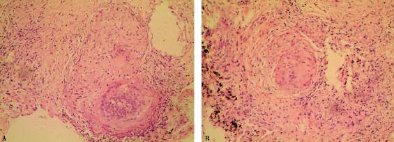 为进一步明确诊断,该患者有经胸腔镜进行肺活检的指征。患者经胸腔镜进行肺活检病理结果提示:非干酪样坏死性类上皮细胞肉芽肿(图3A:HE×100,B:HE×200)、抗酸染色阴性。肺活检组织结核杆菌PCR检查阴性、真菌和结核菌培养均阴性。至此,终于明确诊断。