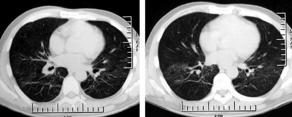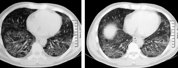 PCP的影像学表现可依病变发展而呈动态变化:病变部位可由肺门周围、下肺后段、内基底段向上肺叶蔓延;病变表现可由最初的肺纹理增粗、肺透光度减低、小灶性渗出及GGO向弥漫性实变过渡。