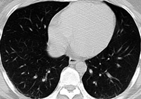 5.胸部CT:两下肺背段少许模糊斑片影(图1)。