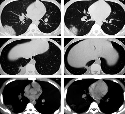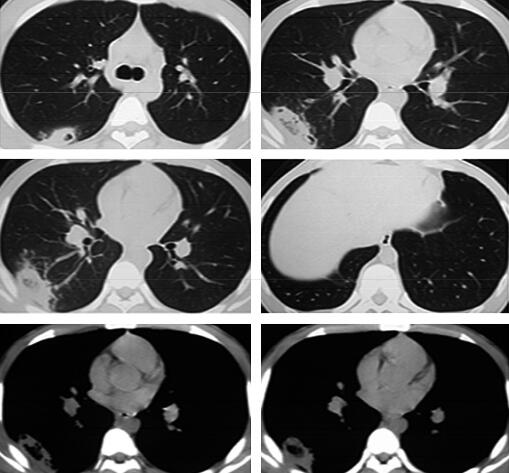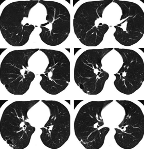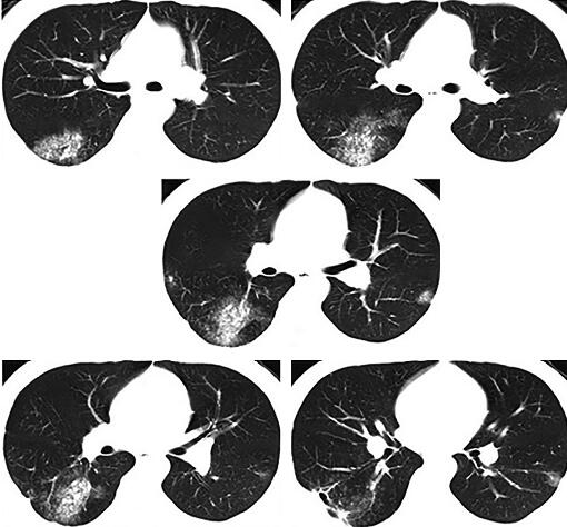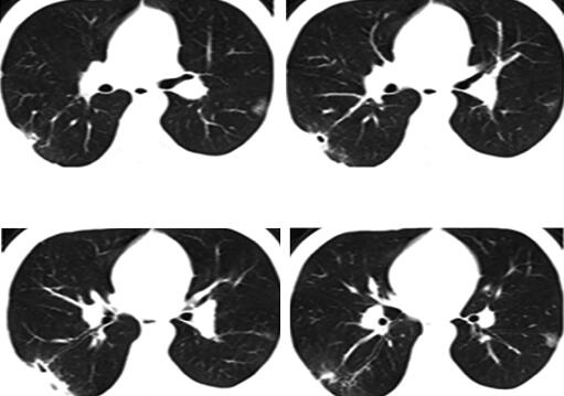 右肺下叶外后基底段散在斑片及片状渗出影,部分病灶呈楔形,尖端指向肺门,右下叶后基底段近脊柱旁片状阴影内见密度减低区,病灶与胸膜粘连(图1)。
