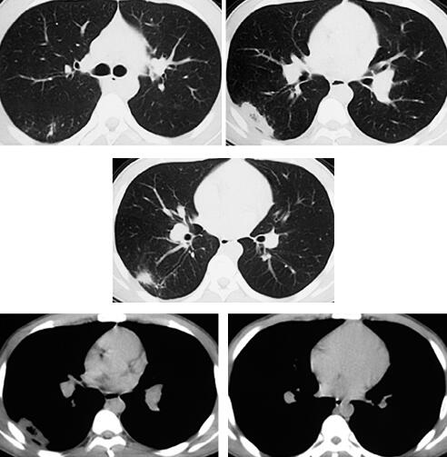 患者为高中学生,体育特长生。既往体健,无慢性咳嗽、喘息病史,无外伤、手术、长时间卧床史。急性起病,受凉后出现寒战、发热,体温最高达41℃,伴有咳嗽、左前侧胸钝痛,活动时感气短,无喘息,无咯血。2013年2月15日于外院住院。