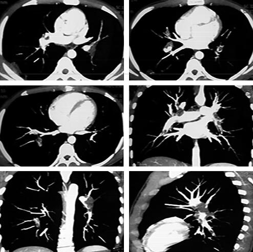 转入我院后详细询问病史得知:患者为高三学生,活动时间很少,虽坚持体育锻炼,但每天仍久坐10小时以上,且饮水少,经过“深挖”得知,本次发病前1个月患者曾有左下肢肿胀,自行好转,未诊治,之后一直有活动时气短,间断胸痛。因为于当地医院住院时的突出症状是寒战和高热,诊断为肺部感染,所以未问及此事。入院查体:体温36.6℃,心率74次/分,呼吸22次/分,血压140/80mmHg。神志清楚,问答合理,口唇无发绀,双肺呼吸音粗,未闻及干湿性啰音,心率74次/分,律齐,P2亢进,各瓣膜听诊区未闻及杂音,双下肢周径:髌骨上15cm:左46cm、右46cm;髌骨下10cm:左34cm、右33cm。至此真相大白,结合病史高度怀疑静脉血栓栓塞症。急查双下肢血管超声示:左侧腘静脉血栓形成;2013年3月14日CT肺动脉造影(CTPA)示:双侧肺动脉内多发充盈缺损影,以双侧肺门区为主(图4)。血D-二聚体3290μg/L。故患者明确诊断为静脉血栓栓塞症、肺血栓栓塞症、左侧腘静脉血栓形成、右下肺梗死合并感染。