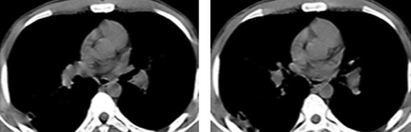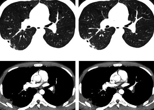 4天后热退,复查血常规白细胞计数及中性粒细胞百分比均恢复正常,治疗似乎有效,但此时患者出现咳铁锈色痰,偶有新鲜血痰,2013年2月27日复查胸部CT示右下叶后基底段原斑片影吸收,但背段有新发小片状阴影,带有小空洞,外基底段病灶也出现多发小空洞(图2),此时本该引起警觉却被“体温下来是硬道理”给冲昏了头脑,关键症状咯血也想当然的用肺炎解释了,治疗上联合左氧氟沙星氯化钠静脉滴注以加强抗感染治疗,2013年3月5日复查胸部CT(图3)可见右肺下叶背段病灶较前缩小,而外基底段斑片状渗出影较前明显吸收,更让医生坚定了肺炎的诊断。但此时的病人仍有气短(仅活动时)和轻度胸痛,咯血有加重倾向,最多一次量约5ml,呈鲜红色,这时医生感到困惑了。