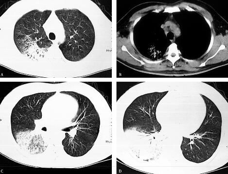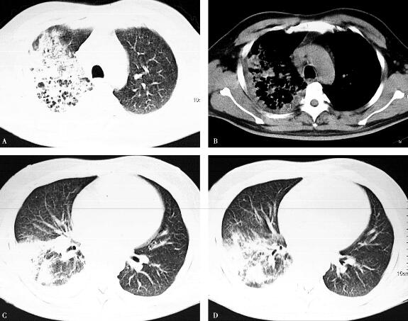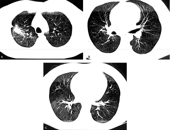治疗10天后,咳嗽、咳痰症状逐渐消失,肺部听诊未闻及湿啰音,体温正常,消化系统、神经系统症状消失,胸部CT较前略有吸收(图3)。治疗两个月后,随访:无不适症状,胸部CT病变明显吸收(图4)。