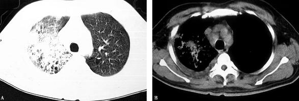6.胸部影像学:右肺多叶、多段片状浸润性阴影,有实变,右胸腔有少量胸腔积液(图1)。