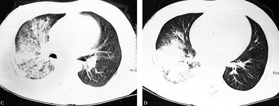 5.胸部CT(治疗5天后):肺部阴影进行性发展(图2)。