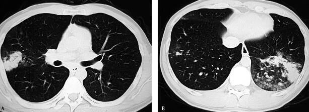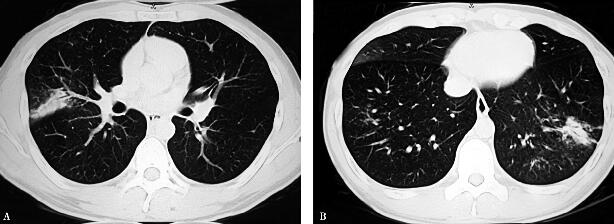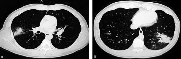 24小时后体温下降。咳嗽减轻,痰易咳出,头痛及四肢肌痛基本缓解。酶学检查:恢复正常。胸部CT表现(2008年7月1日):病灶明显吸收(图3A右肺中叶斑片影、B左肺下叶斑片影)。