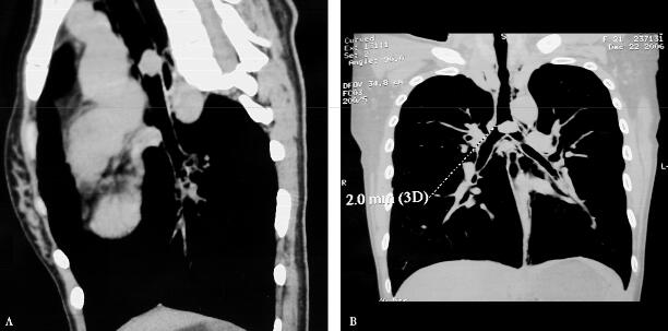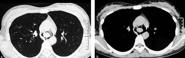 补充上述病史资料后,诊断思路逐渐清晰,患者气道内有阻塞因素,是异物附着在气管壁上?还是气管内肿物?需要进一步做胸部CT检查。胸部3D CT结果显示在隆突上方主气管内生长一肿物(图1A肺窗、B纵隔窗;图2A矢状位、B冠状位),左侧有蒂。因此解释了患者的临床症状特点,右侧卧位时,肿物下坠,将气管完全阻塞,造成患者窒息。左侧卧位时肿物与支气管右侧壁间留有缝隙,使呼吸困难稍有缓解。当气流通过狭窄的气管缝隙时产生哮鸣音,出现喘息症状。并随着肿物的增长,症状日趋严重。继而行纤维支气管镜检查,在隆突上方有圆形结节样肿物几乎将气管完全阻塞(图3),因肿物位置较高,未做活检,活检取材可能因创面出血导致窒息危及生命。