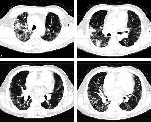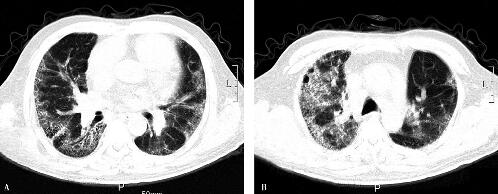患者为工人,主要从事装卸工作,每天接触汽车尾气。既往身体健康,无呼吸系统疾病病史,无心脏病及无风湿病病史,无禽类接触史,无特殊粉尘接触史,无双下肢水肿及静脉炎病史,无外伤,手术及骨折病史。有慢性咳嗽,呼吸困难症状2年,外院曾诊断为间质性肺疾病(ILD)。本次发病为冬季急性起病,1周前因受凉感冒为诱因出现咳嗽、咳痰,痰为脓性,咯血,为痰中带血。2天前咳嗽、咳痰加重伴发热。