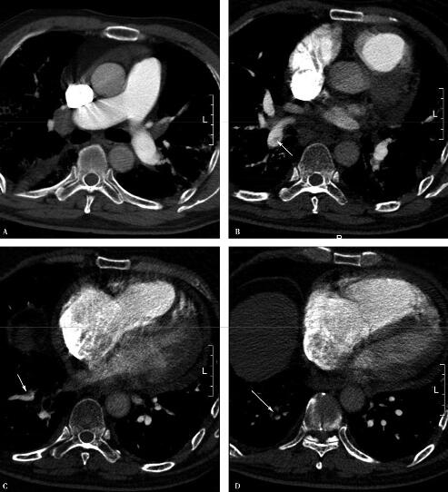 肺动脉CTA(2011年1月13日):右下肺动脉栓塞,心包积液(图3)。