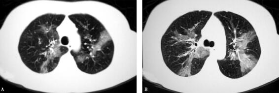 予甲泼尼龙每日40mg及其他平喘药物治疗10天后(2011年12月19日)复查胸部CT,症状好转,肺部干鸣音消失,胸部CT示双肺斑片状浸润影明显吸收(图3)。复查血常规:白细胞计数8.2×109/L,中性粒细胞百分比75.5%,嗜酸粒细胞百分比0.7%。糖皮质激素治疗后病情明显好转。继续口服糖皮质激素,逐渐减量共计服用1年,症状控制。目前停用糖皮质激素半年余,未复发。