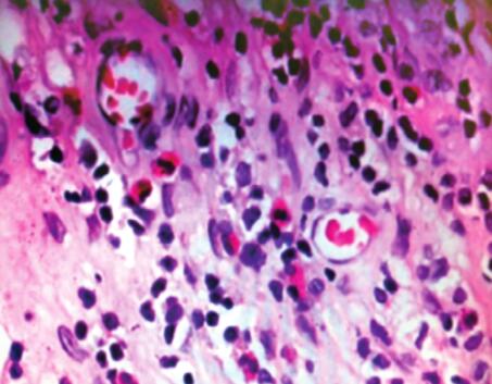 两次痰真菌培养阴性,真菌涂片未见菌丝;两次1,3-β-D-葡聚糖(-);血总IgE仅轻度升高;胸部CT影像学存在反复肺部浸润影,但未见中心性支气管扩张,故ABPA诊断依据不足。入院后患者自诉此次发作伴双上肢麻木,既往否认颈椎病史,头CT未见异常,遂行周围神经传导速检查,结果提示双上肢正中神经损害。并借阅外院4年前(2007年6月12日)鼻息肉手术病理片(图2),结果提示:慢性黏膜炎,伴血管外嗜酸性粒细胞浸润。