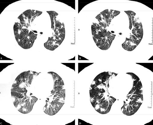 双肺多发结节影、斑片影(图1肺窗,图2纵隔窗)。