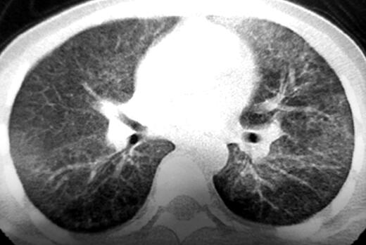 青年男性患者,农民,未婚,既往体健,否认呼吸系统疾病及其他慢性疾病史,无饲鸽、发霉物质接触史。1个月前受凉后出现发热,伴寒战,最高体温达40℃,呈稽留热,伴咳嗽、少许白痰,呼吸困难,活动后明显,无夜间憋醒,就诊于当地医院行胸部CT检查示:双肺对称的弥漫性分布的磨玻璃影(如图1、图2),予抗感染治疗,先后静脉滴注红霉素、头孢哌酮-舒巴坦半月余(具体用法用量不详),体温较前有所下降,但未降至正常,咳嗽、呼吸困难症状未见明显缓解,为求进一步诊治来诊。病来无胸痛、咯血,无腹痛、腹泻,无头痛,头晕,精神状态差,饮食睡眠差,二便可,近一月体重减轻约8kg。