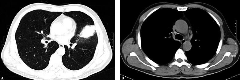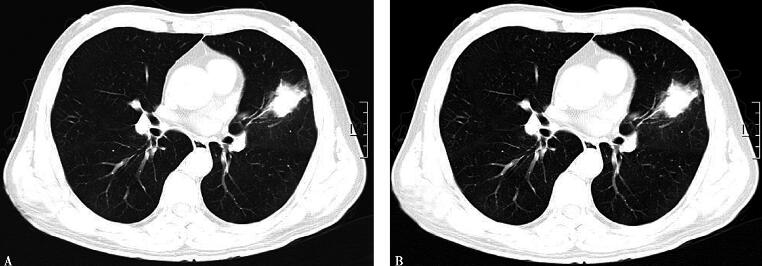 左肺上叶舌段内见团块状密度增高影,周围有毛刺,呈支气管截断征,伴斑片状渗出影,纵隔内见淋巴结肿大(图1)。