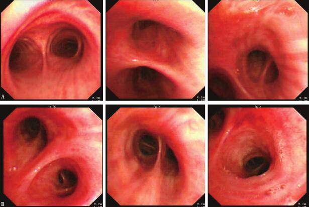 纤维支气管镜下所见:气管隆嵴锐利,左、右肺各叶、段、亚段均未见异常改变(图2),于左舌叶支气管行经支气管壁透壁肺活检技术(TBLB),病理回报:送检组织内有较多淋巴浆细胞浸润,有纤维组织增生,结合临床。