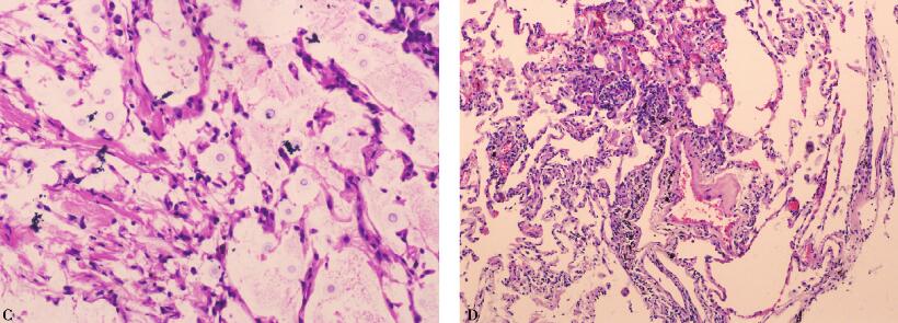 3.开胸活检后的病例明确诊断后,我们找到在纤维支气管镜下肺活检的病理片。仔细辨认发现了有符合隐球菌的圆形孢子样结构,只是数量太少没有发现。提示临床医生要和辅助科室的医生多沟通交流病情,这样才能尽早的做出准确无误诊断。