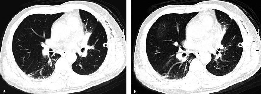 【治疗效果】患者入院后第四天因外出归来后出现发热,体温达37.4℃,查体咽部充血、红肿,听诊双肺未闻及干湿啰音,考虑上呼吸道感染,给予喜炎平抗病毒治疗。3日后患者体温仍未得到有效控制,仍有发热,体温最高达38.4℃。辅助检查结果:痰培养回报阴性。