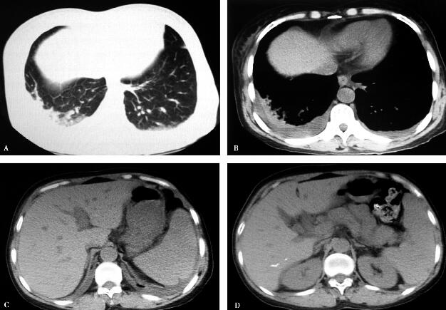 7.全腹CT:(2013年7月15日,图1)双肺下叶少许斑片影、双侧胸腔少量积液,肝右叶胆管结石,胆囊炎,脾增大,少量腹水,上腹部肠系膜周围可见少许渗出。