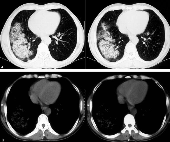 右肺大片斑片影(图1 A肺窗,B纵隔窗)。
