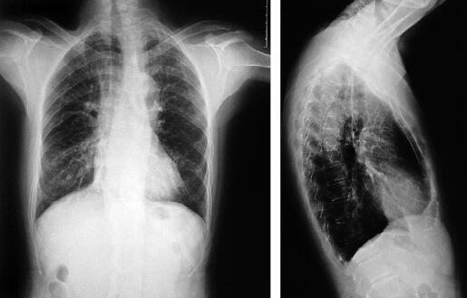 患者为电工,既往体健。吸烟40年,每天吸烟约10支。患者于1个月前无明确诱因出现咳嗽,夜间明显,无咳痰,偶感气短,但无喘息。未服用任何药物,症状逐渐加重。近2周自觉发热,未测体温。夜间偶有发冷和寒战,无盗汗。发病2周时胸部X线示右下肺透过度略下降(图1),口服“头孢”一周效果不佳。行血常规检查发现外周血白细胞计数增高,为15.7×109/L;嗜酸性粒细胞增高,计数达6.94×109/L,百分比为44.2%,静脉使用头孢类抗生素(具体药物及剂量不详),三天后复查外周血白细胞计数仍增高(17.6×109/L),嗜酸性粒细胞为8.98×109/L,百分比为51%。治疗一周症状无改善。为明确诊断及治疗来诊。
