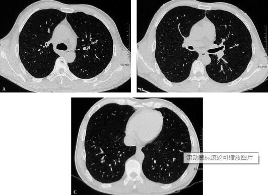 为除外嗜酸性粒细胞增多同时伴肺部或支气管受累的其他疾病,该患者行支气管肺泡灌洗,镜下支气管及黏膜未见异常,灌洗液中细胞总数为0.06×109/L,巨噬细胞百分比为88%,中性粒细胞百分比为3%,淋巴细胞百分比为4%,嗜酸性粒细胞百分比为5%。尽管支气管肺泡灌洗液中嗜酸性粒细胞较正常略增多(正常参考值为0~1%),但不足以诊断嗜酸性粒细胞肺浸润。