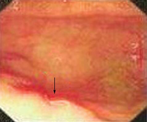 患者有消化道症状,在住院期间恶心加重,未吐,并出现腹泻,便次逐渐增加,住院一周时约每天4~5次。尽管入院时便常规未见异常,两次便检查均未查到寄生虫卵,不除外胃肠道疾病引起的嗜酸性粒细胞增高(如肠道肿瘤、溃疡性结肠炎、克罗恩病等),为明确诊断行纤维肠镜检查。镜下见盲肠散在斑状充血糜烂,并可见一条钩虫活动,诊断为大肠钩虫病,大肠炎(图3,箭头所指为活动的钩虫成虫)。至此,该患者诊断明确,嗜酸性粒细胞增多的原因为肠道寄生虫(钩虫)感染。胸部X线示一过性磨玻璃影考虑为Loffler's syndrome(吕弗勒综合征)。