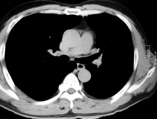 左主支气管内见结节样肿物阻塞管腔,病灶强化不明显,局部低密度灶(图1)。