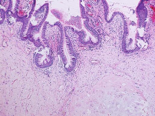 支气管肿物首先用电圈套器切除大部分,然后应用冷冻切除,肿物几乎被完全切除,左上叶支气管及左舌叶支气管清晰显示。复查胸部CT左主支气管管腔通畅(图2)。患者术后咳嗽、咳痰症状明显缓解。再次送检病理结果,肿物内可见混有成熟软骨、平滑肌组织,病理报告为错构瘤(图3HE×40)。