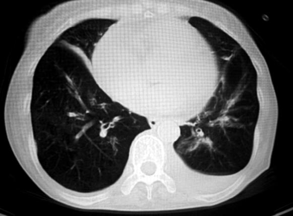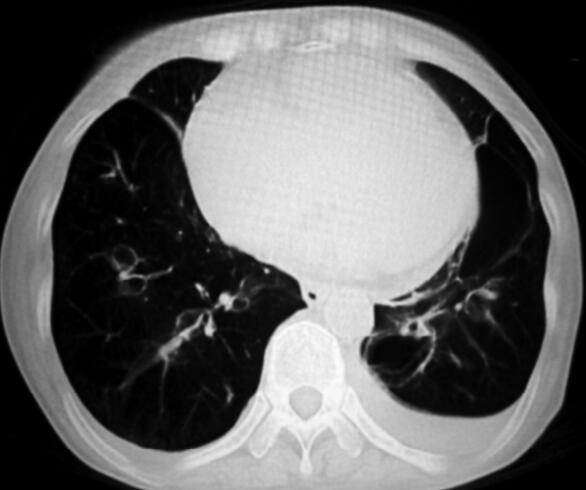4.胸部CT:肺气肿,双肺多发肺大泡(图1)。