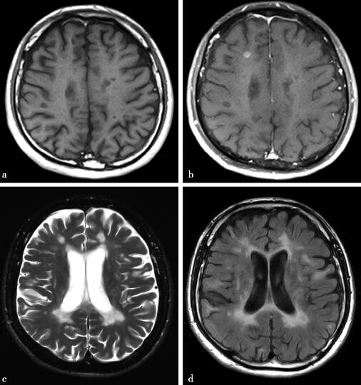 图1a,轴位T1WI见双侧侧脑室旁及胼胝体层面白质区数个类圆形稍长T1信号影。1-4-6b,轴位T1WI增强,见右侧额叶皮层下病灶结节样强化。图1c~d,轴位T2WI和FLAIR序列。图1a,见病灶呈稍长T2信号影